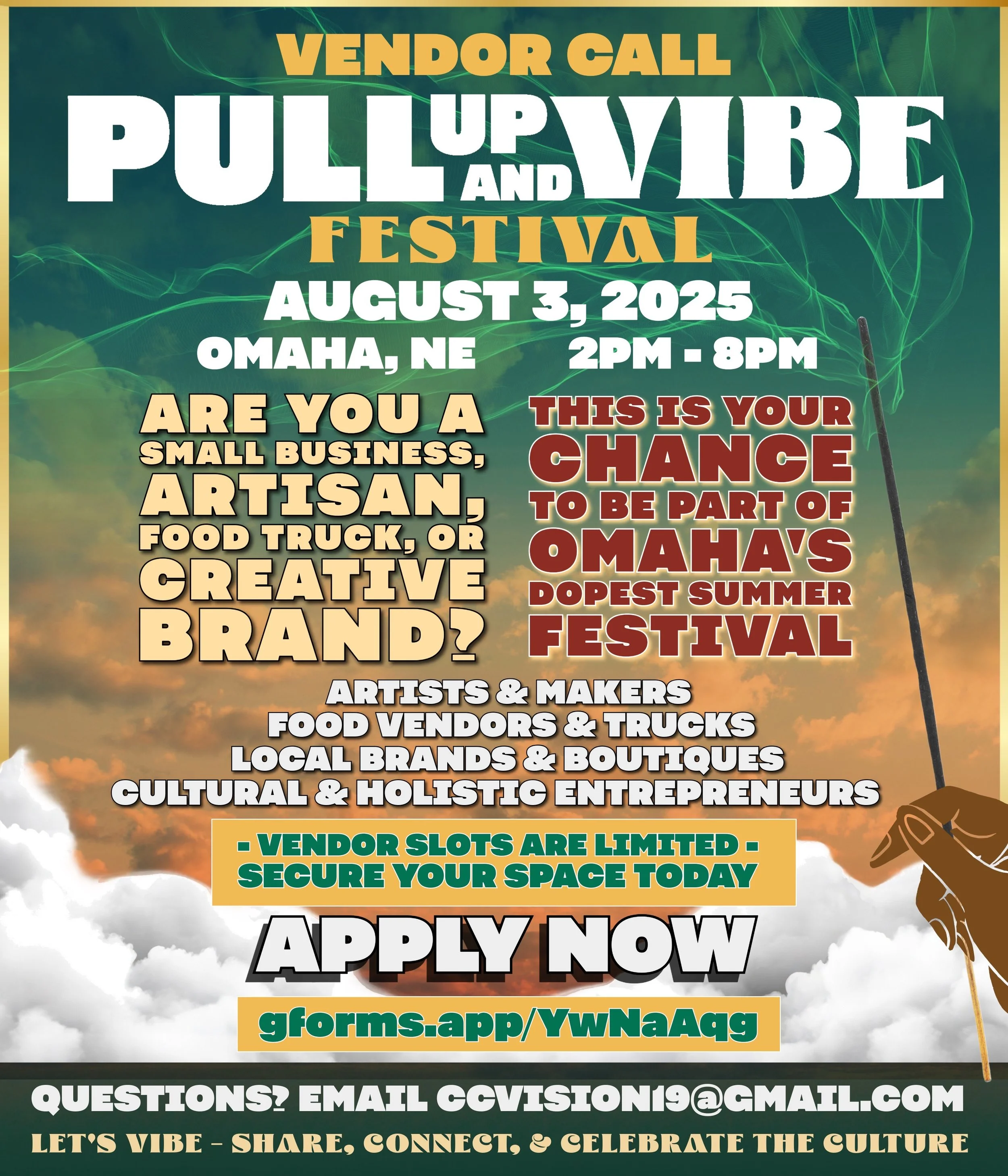 Be part of a high-vibe, deeply rooted cultural celebration! Pull Up and Vibe is more than just a music festival — it’s a living tribute to North Omaha’s rich history of blues and soul. We’re inviting local businesses, artisans, and food vendors to bring their unique flavor to this experience.